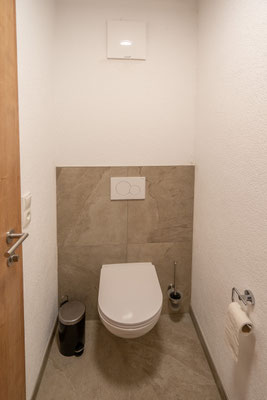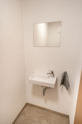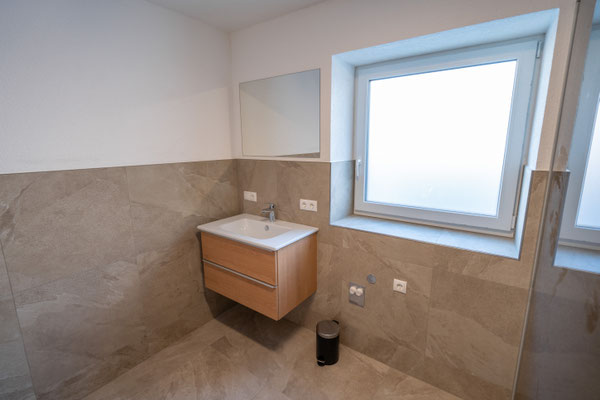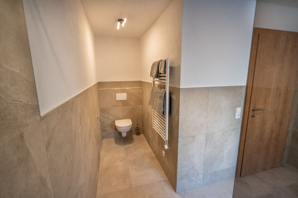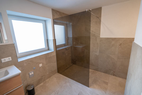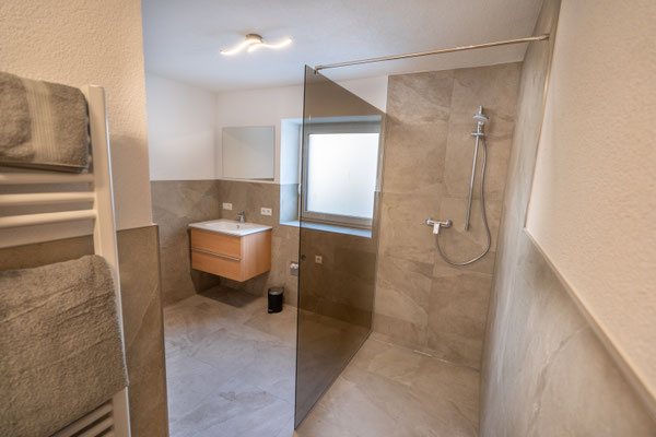 Das modern gestaltete Bad bietet viel Platz und ist mit einer "Walk-In-Dusche", einem WC, einem Waschtisch und einem Handtuchtrockner ausgestattet.